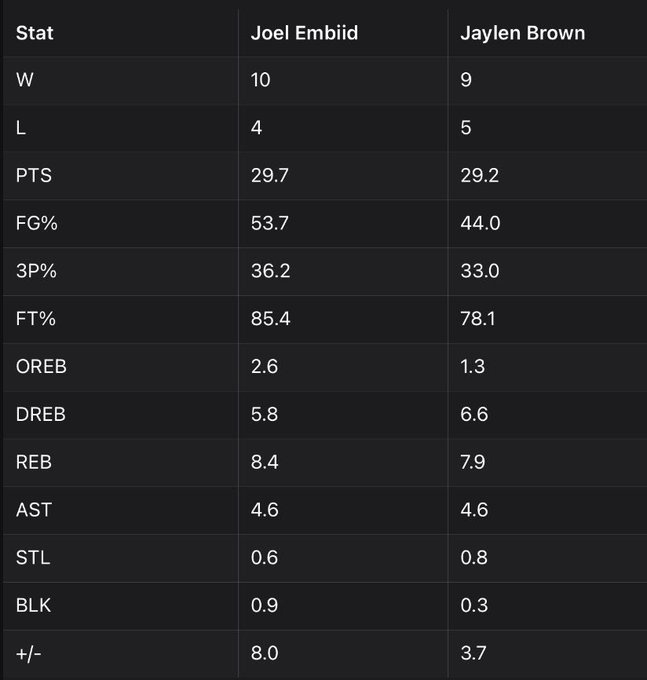 随后,Drew Hanlen还晒出了恩比德和布朗一月的数据对比。